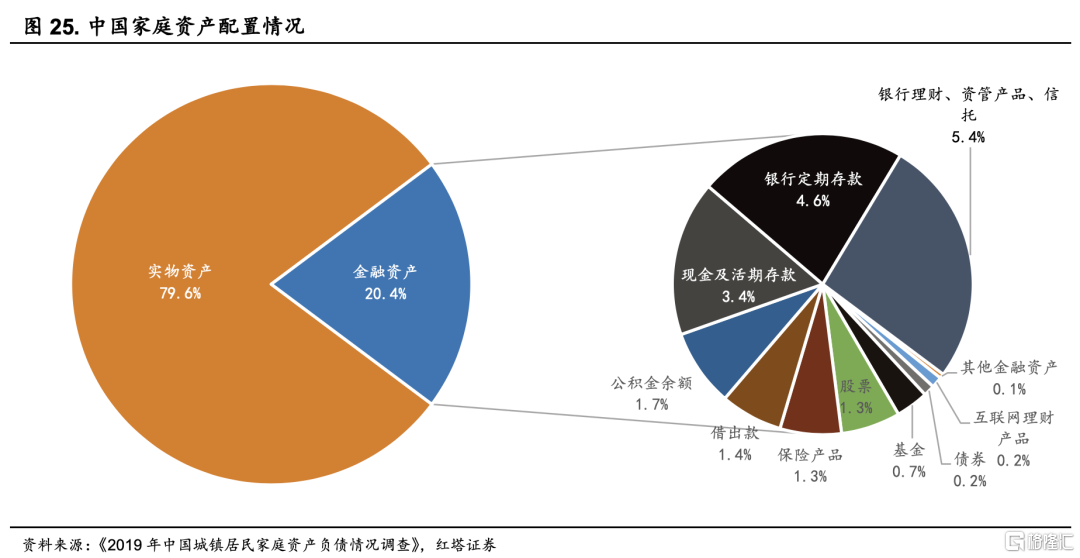 中国的储蓄率向来居高,居民的风险厌恶程度也高,出于保本的安全考虑,更愿意把钱存到银行去。根据央行2019年对中国城镇居民家庭资产负债情况的调查,我们可以看到,居民资产中80%是以房地产为主的实物资产,金融资产占比本身就不高。而在金融资产中更多的是银行存款和银行理财,股票、基金等风险资产配置占总资产比例不及3%。