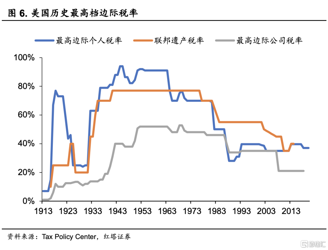 从50年代至60年代初,美国最高档个人所得税税率高达90%以上,这对于富人阶层的收入影响很大。在遗产税方面,冷战期间税率也一度高达77%,如果一个非常富裕的家庭的后代想要继承父母财产的话,超过3/4的部分都要被政府征收。同期的英国、日本等资本主义国家在美国的影响之下,也同样对富人实行着极为苛刻的税收制度。