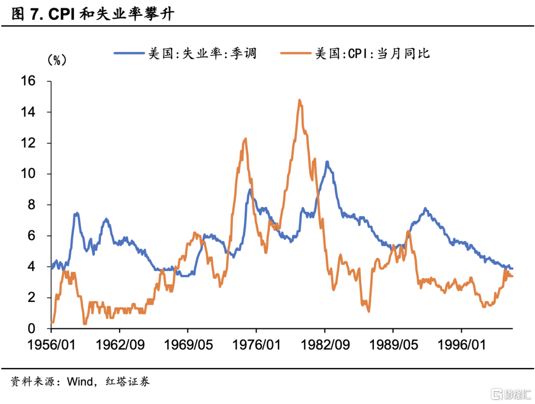 通货膨胀率和失业率攀升。由于石油等能源在CPI中的比重较高,油价的快速上行助推了通胀,CPI在80年4月达到了15%。同时失业率波动上升,在1982年末来到了阶段性的顶点10.8%。