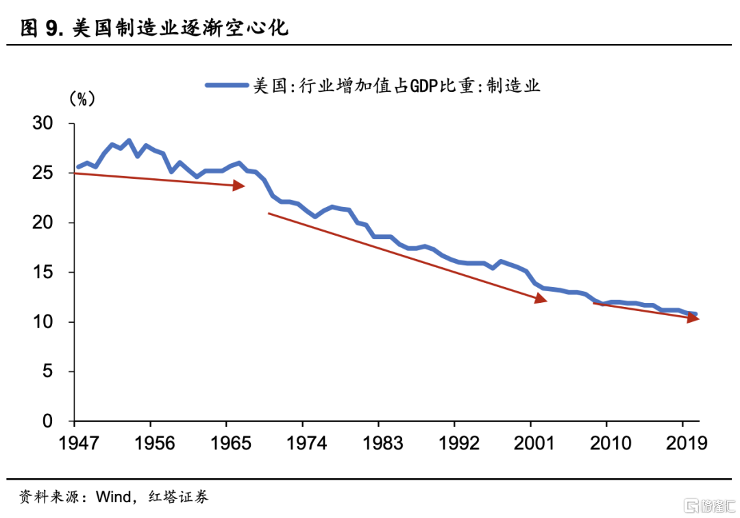 但是70年代滞胀发生之后,迫于生产成本攀升的压力,一些汽车、家电制造等劳动密集型产业,或者是产业中劳动密集的加工环节全都被陆续转出,国内只留下了最核心的研发部门。在美国,“去工业化”越来越明显,制造业逐渐空心化,制造业增加值占GDP比重一降再降。