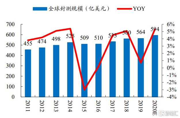 1、 封装规模:受益于半导体产业向大陆转移,国内封测市场增速高于全球