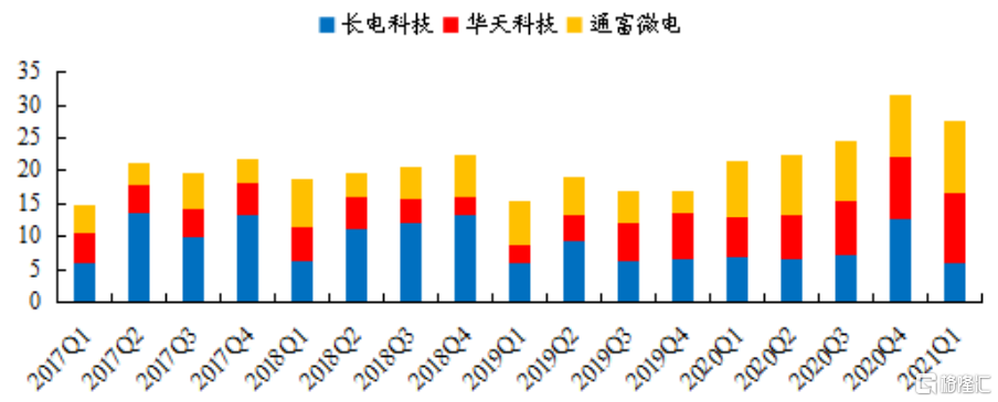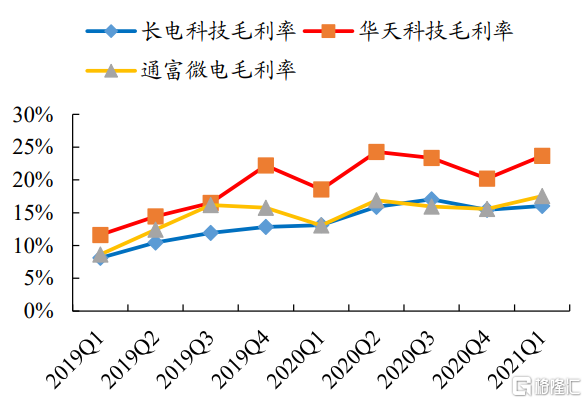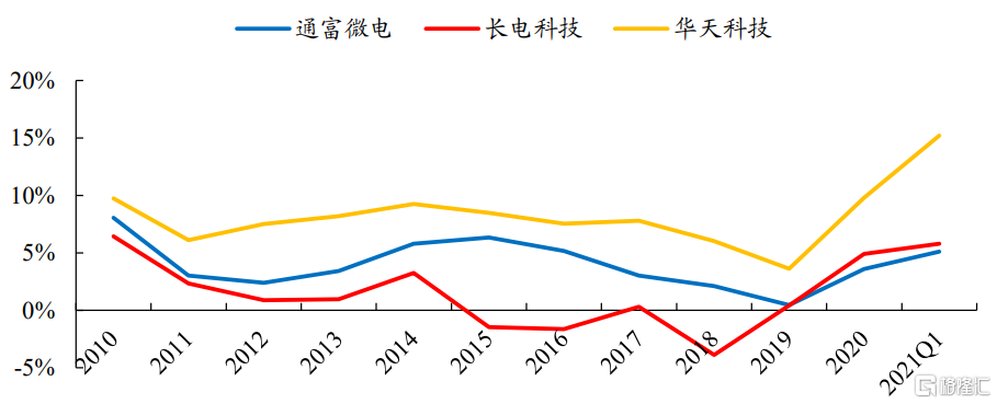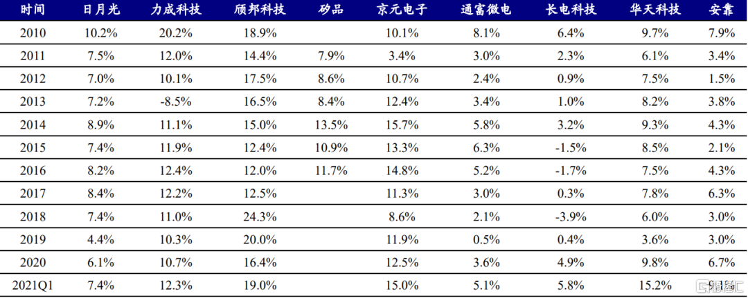 国内封测龙头厂商仍有较大盈利提升空间。2020年以来,国内封测龙头公司净利率均有所提升,长电科技/华天科技/通富微电2021Q1净利率分别为5.8%/15.2%/5.1%,同比提升1.5/0.9/5.4pcts,而与国外龙头相比,全球前10封测龙头2020Q3净利率平均达12.6%,而中国大陆龙头封测厂2020Q3净利率平均值8.7%,盈利能力仍有进一步的提升空间。