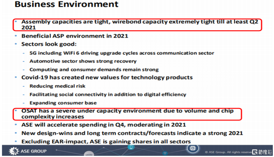封测产能紧张状况已延伸到封测原材料及设备部分。据日月光2020年10月底业绩说明书,公司封装产能紧张,引线键合业务产能严重短缺且预计将持续到2021Q2。
