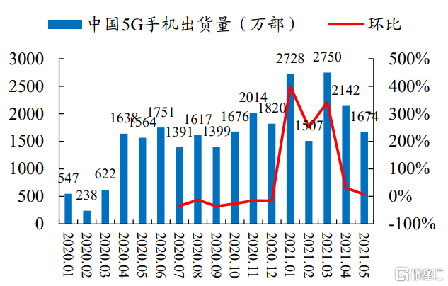 封测景气度较高的最根本原因在于下游如新能源汽车、5G手机等需求的旺盛。据EV Sales数据,新能源汽车销量2020年7月以来高速增长,同比增速均维持在60%以上,2021年4月/5月,全球新能源汽车销量为分别为39/44万辆,同比增长256%/205%,新能源汽车相比于传统汽车,电子化程度更高,因此进一步带动了半导体需求增长。而2020年开始,国内5G手机开始放量,各个手机品牌争先推出多款5G手机,据信通院数据,从2020年4月开始,中国5G手机出货量基本保持在1500万部以上,5G手机的旺盛需求驱动功率、射频等各类电子元器件需求大增,进而带动对封测的需求。