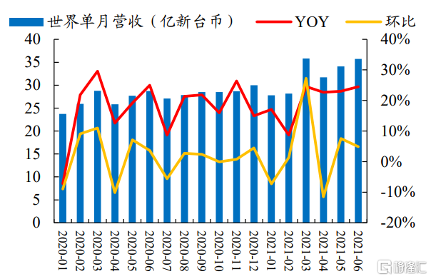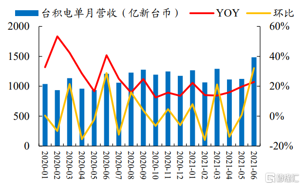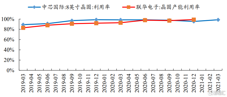 下游需求旺盛还体现在全球晶圆厂景气度高,产能满载。以台积电及联华电子为例,两者2020年来营收规模均呈同比增长态势,且2021年5月及6月营收均环比增长,特别是8英寸晶圆代工产能供不应求,而中芯国际和联华电子的产能利用率已经接近100%。