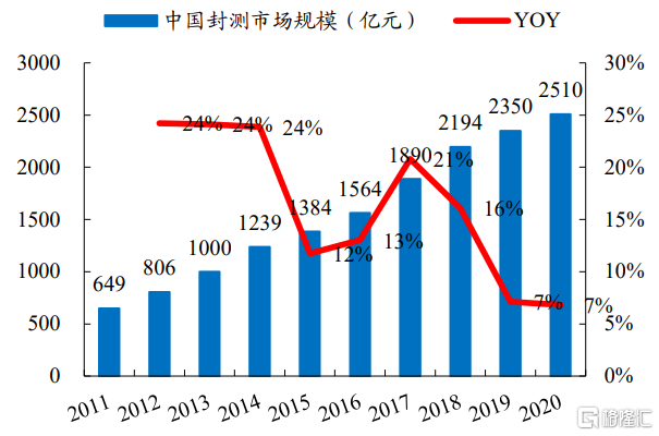 全球封测市场规模稳定增长,国内封测市场增速高于全球。据Yole数据,全球封测市场规模保持平稳增长,2020年达594亿美元,同比+5.3%。受益于半导体产业向大陆转移,国内封测市场高速发展,增速显著高于全球,据中国半导体行业协会数据,2020年国内封测行业市场规模达2510亿元,同比+6.8%,2016年至2020年CAGR约12.5%。