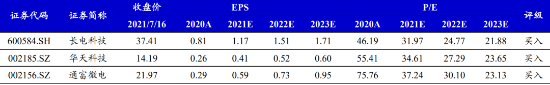 (2)国产替代:半导体产业国产替代为封测行业带来机遇。2019年华为实体名单事件以来,国内IC从业者愈加深刻认识到核心技术自主可控的重要性,无论是集成电路设计、制造还是封测,都开始着重培养与扶持本土供应企业,转单趋势愈加明显。随着未来中美摩擦的进一步加剧,全球半导体产业链将有可能迎来重构,而封测乃是国内半导体最为成熟的一环,需求将进一步提升。