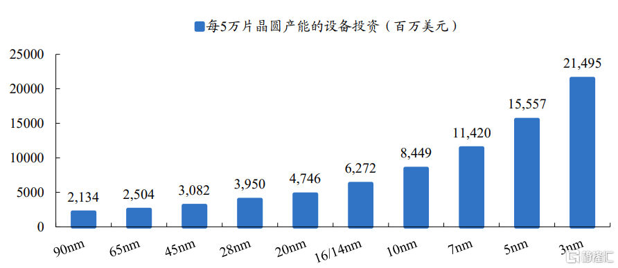 随着技术节点升级,集成电路制造的设备投入呈大幅上升的趋势