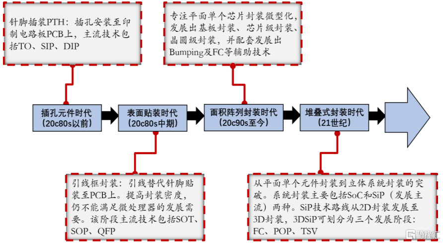 因上述原因,摩尔定律逐渐放缓,后摩尔时代到来,先进封装因能同时提高产品功能和降低成本是后摩尔时代的主流发展方向。半导体封装技术发展大致分为四个阶段,全球封装技术的主流处于第三代的成熟期,主要是CSP、BGA封装技术,目前封测行业正在从传统封装(SOT、QFN、BGA等)向先进封装(FC、FIWLP、FOWLP、TSV、SIP等)转型。