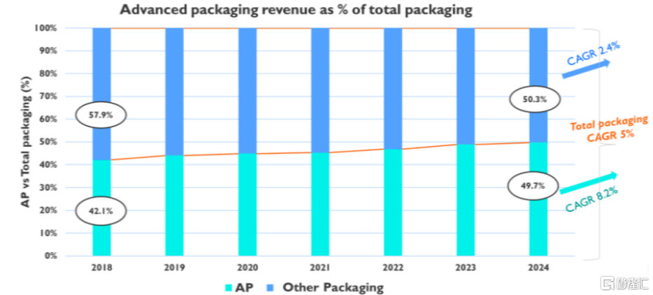 在5G、消费电子、物联网、人工智能和高性能计算等更高集成度的广泛需求下,先进封装市场增速预计将高于传统封装。据Yole数据及预计,全球先进封装市场规模2024年预计近440亿美元,2018-2024年CAGR预计达8.2%。而在同一时期,传统封装市场规模CAGR预计仅为2.4%,整个IC封装产业市场规模预计CAGR为5%。
