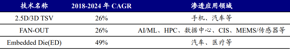 主流先进封装技术渗透领域广泛,增速较高。随着智能驾驶、AIOT、数据中心及5G等市场的成熟,据Yole数据及预计,2.5D/3D TSV、FAN-OUT、ED等主流先进封装技术的市场规模将保持高速增长,2018-2024年CAGR分别达26%、26%、49%。