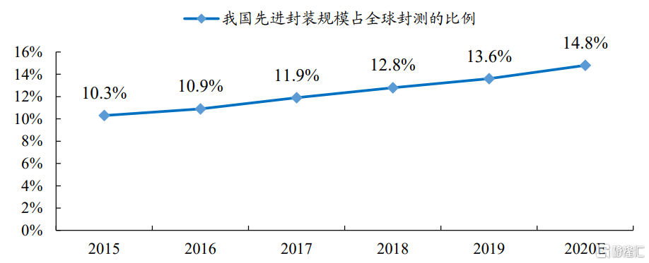 中国先进封装市场产值全球占比较低,但是占比稳步提升,国内封测厂技术平台已经基本和海外厂商同步。我国的封装业起步早、发展快,但是主要以传统封装产品为主,近年来国内厂商通过并购,快速积累先进封装技术,技术平台已经基本和海外厂商同步,WLCSP、SiP、TVS等先进封装技术已经实现量产,2015-2019年先进封装占全球比例逐渐提升,2020年预计达14.8%。