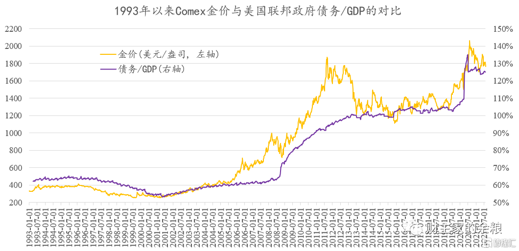 这幅图展示了1993年以来,黄金价格变动与美国联邦政府债务/GDP的变动情况,是不是发现拟合得相当的好。