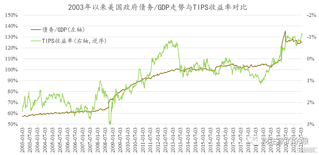 显然,用抗通胀国债(TIPS)的收益率,代表持有美元的实际收益,虽然真实收益率看起来上蹿下跳,但过去18年的整体走势,却完全围绕着债务/GDP比例在“表演”。