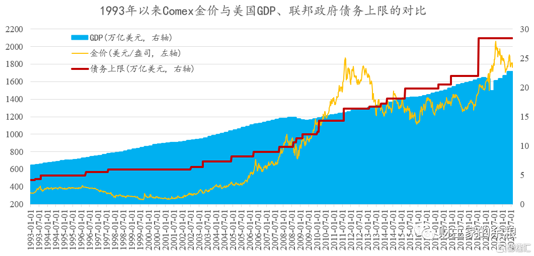 有了以上分析,我们可以断定,每一轮美国政府债务上限的提高,如果不能与美国GDP的增长相匹配,那么大概率会带来金价的上涨。