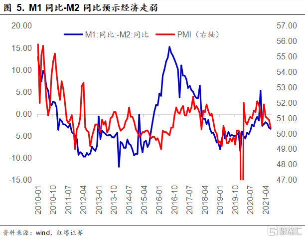 另外,M1表示货币的活化程度,如果企业预期未来经济会好转,那么它们就会将存款活期化,方便用于后续支出,即M2会向M1转化,对应于M1-M2的扩大。反之,则相反。从数据上我们也能够看到M1-M2的差值与PMI的走势有明显的相关性。