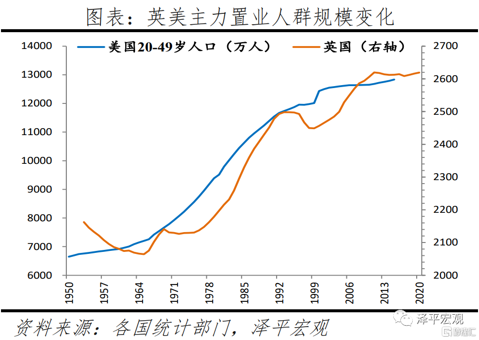 二是人口结构变化影响房价。20-50岁主力置业人群、家庭户规模等人口结构变化,将引致住房需求变化。在家庭户规模方面,由于结婚年龄推迟、不婚率和离婚率提高、低生育率、寿命延长、人口老龄化、人口流动等,导致全球家庭户规模呈小型化趋势,这增加了一定的住房需求。1960-2015年,美国家庭户规模从3.33降至2.54人,日本从4.14人降至2.39人;此外,1980-2015年,韩国从4.78人降至2.73人。在主力置业人群方面,美国20-49岁人口规模尚在持续增长,日本、韩国、英国分别已在1996、2004、2011年见顶,主力购房人群的规模变化对房地产市场具有非常显著的影响。