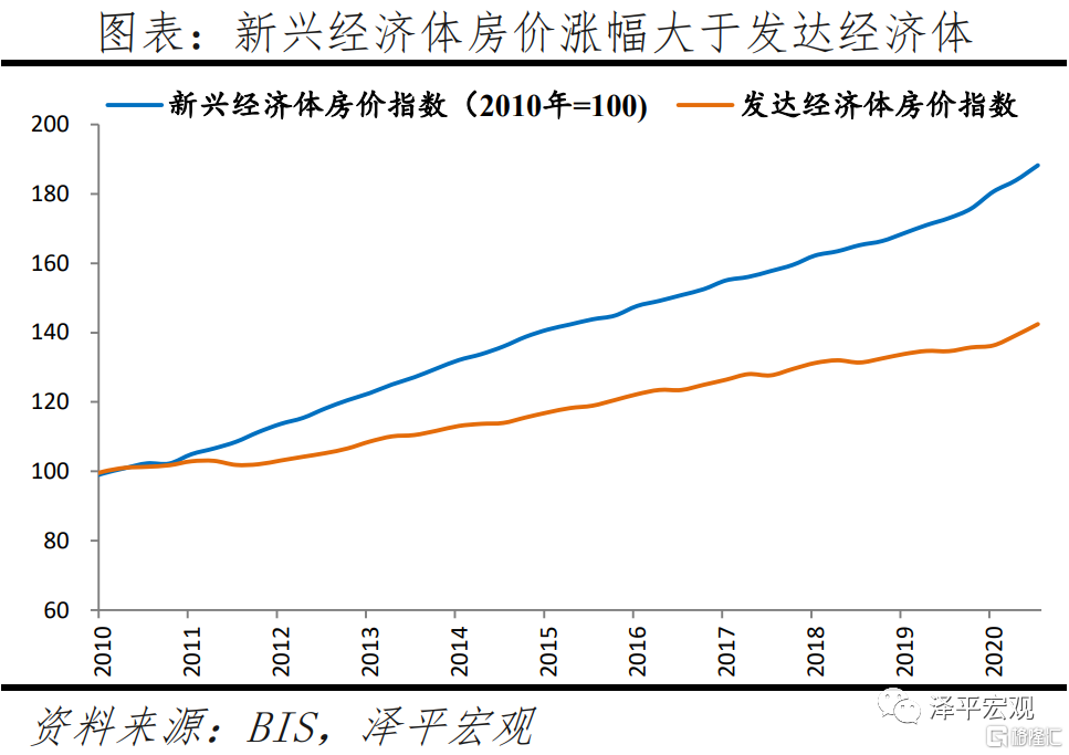 由于新兴经济体广义货币增长较快,因而以本币计算的房价涨幅较发达经济体更大。根据世界银行数据,2001-2020年印度、墨西哥等9个代表性新兴经济体广义货币年均增速平均为13.7%,明显高于英美日等6个代表性发达经济体的5.3%.据BIS统计,2010-2020年新兴经济体房价年均增长6.8%,超过发达经济体3.8%的房价年均增速。