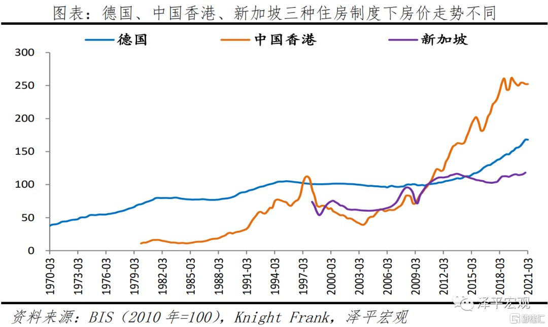4)住房制度影响的供求格局。住房制度是一国房地产市场导向,一个好的住房制度能使房价长期稳定、支持实体经济发展,一个坏的住房制度可能引发房价暴涨暴跌、削弱甚至掏空实体经济。德国房价之所以长期稳定,关键在于其居住导向的住房制度设计,三大支柱分别为:中性稳健的货币政策与住房金融体系,鼓励居民长期持有住房、打击投机的税收制度,保护租户权益、鼓励长期租房的租赁制度。新加坡目前形成以组屋为主、私宅为辅的二元化供应体系,供给结构呈现“廉租房-廉价房-改善型组屋-私宅”的阶梯化分布,住房自有率超过90%,基本实现居者有其屋。