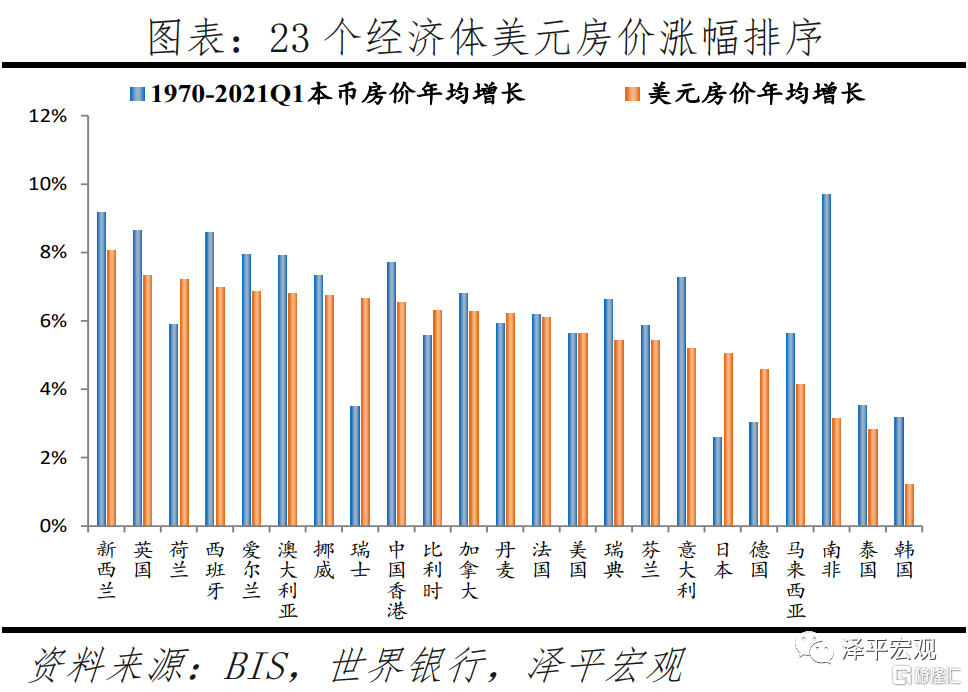 以美元计,1970-2021年Q1,23个经济体房价涨幅发生明显变化,且美元房价涨幅与美元名义GDP增长存在一定相关性。如果一经济体货币超发较美国严重,则货币将对美元贬值,因此本币房价大幅上涨并不意味着美元房价大幅上涨,在全球来看并不一定具备投资价值。依据美元房价涨幅,可大体分为四类:一是累计涨幅超过50倍和年均增长超过8%,仅新西兰1个。二是累计涨幅25-35倍和年均增长7%-7.5%,有英国、荷兰、西班牙3个经济体。三是累计涨幅10-20倍和年均增长5%-6.9%,有爱尔兰、澳大利亚、挪威、比利时、意大利、日本等14个经济体。四是累计涨幅低于9倍和年均增长5%以下,有德国、马来西亚、南非、泰国、韩国5个经济体。与本币房价涨幅相比,变化最大的是南非,1970-2021Q1年本币房价涨幅高达110.5倍,但美元房价涨幅仅3.8倍。此外,瑞士本币房价涨幅仅4.8倍,但美元房价达25.9倍;意大利本币房价上涨34.7倍,但美元房价涨幅缩至12.1倍;德国本币房价上涨3.6倍,美元房价上涨8.8倍。