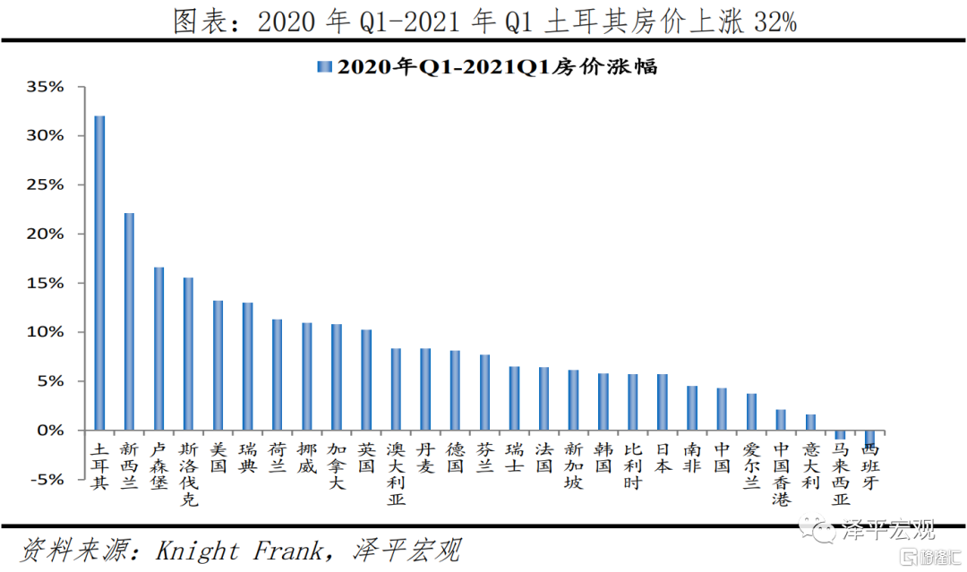 近一年主要经济体房价平均上涨超7%,土耳其上涨32%,新西兰超20%。根据KnightFrank数据,2020年Q1至2021年Q1,土耳其房价上涨32%,高居榜首;紧随其后的新西兰上涨22%;卢森堡位居第三,涨幅为16.6%;斯洛伐克位居第四,涨幅为15.5%;美国位居第五,涨幅为13%,创2005年以来最大涨幅。而亚洲主要国家涨幅低于全球平均,新加坡房价涨幅最大,为6.1%;紧随其后的日本上涨5.7%;中国房价涨幅为4.3%。