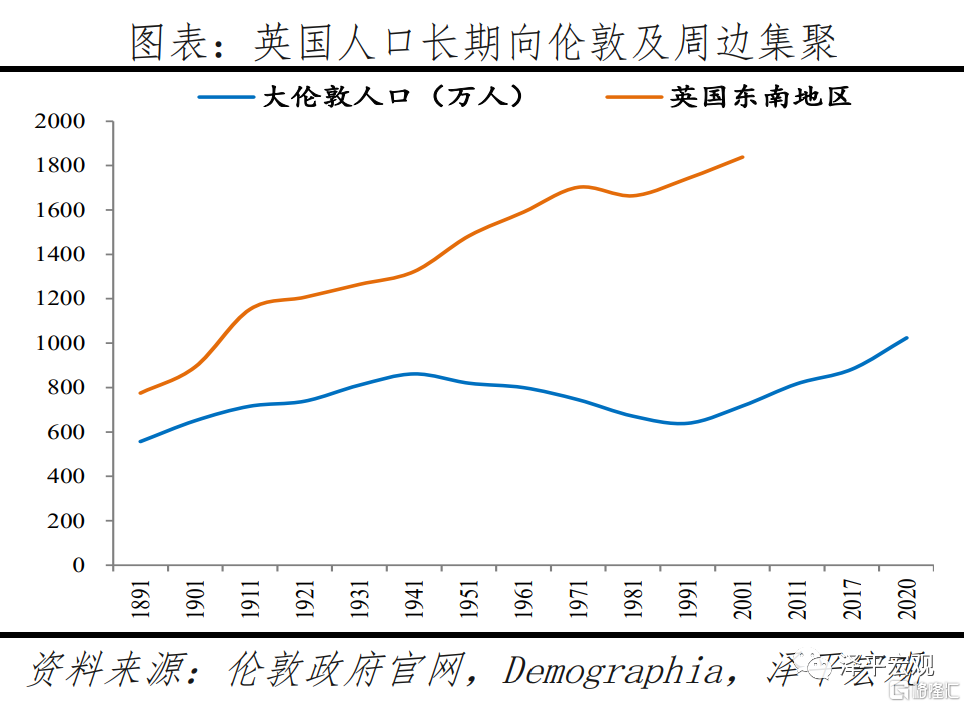 伦敦有三个范围:伦敦城(City of London)、大伦敦(Greater London)、伦敦都市区。伦敦城即伦敦金融城、面积很小,一般意义上的伦敦指大伦敦地区,包括319平方公里的内伦敦和1254平方公里的外伦敦,土地面积合计1573平方公里、占英国的0.6%;伦敦都市区则由大伦敦及周边地区组成。由于城市规划问题等造成大城市病突出,英国政府一度控制伦敦特别是内伦敦人口、在二战后外迁产业、大量建设新城,1941-1991年年伦敦人口从862万降至639万,后回升至2017年的882万,当前占英国人口比重为13.4%。但在经济作用下,伦敦周边地区人口长期集聚,1931-2001年英国东南地区人口从不到1300万增至1800多万,占比从27.5%增至31.1%。