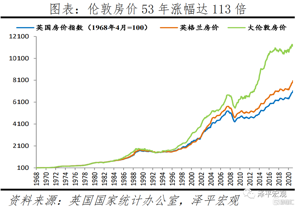 近53年大伦敦地区房价涨幅达113倍,远超英国、英格兰地区房价平均涨幅(71、81倍),和英国名义GDP涨幅(51倍)。根据英国国家统计办公室(ONS)数据,在英国,1968年-2021年3月,大伦敦地区房价从0.44万英镑/套上涨至50万英镑/套,英格兰地区从0.34万英镑/套上涨至27.5万英镑/套,全国从0.36万英镑/套上涨至25.6万英镑/套,伦敦地区房价涨幅达113倍,高于全国的71倍和英格兰地区的81倍。而同期(1967-2020年)英国名义GDP上涨50.7倍、年均增长7.7%,房价涨幅明显跑赢名义GDP增长。