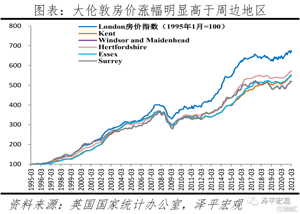 从伦敦都市区内部看,近26年大伦敦房价涨幅超6.5倍,位居地区首位,周边地区涨幅均低于6.0%。1995年1月至2021年3年,大伦敦房价上涨6.7倍,而Kent、Hertfordshire、Essex、Windsor and Maidenhead、Surrey周边地区的涨幅分别为5.5、5.7、5.5、5.2、5.4倍,大伦敦区房价涨幅明显高于周边地区。此外,该时期英国第二大城市伯明翰房价上涨仅4.6倍,明显低于伦敦及周边地区涨幅。
