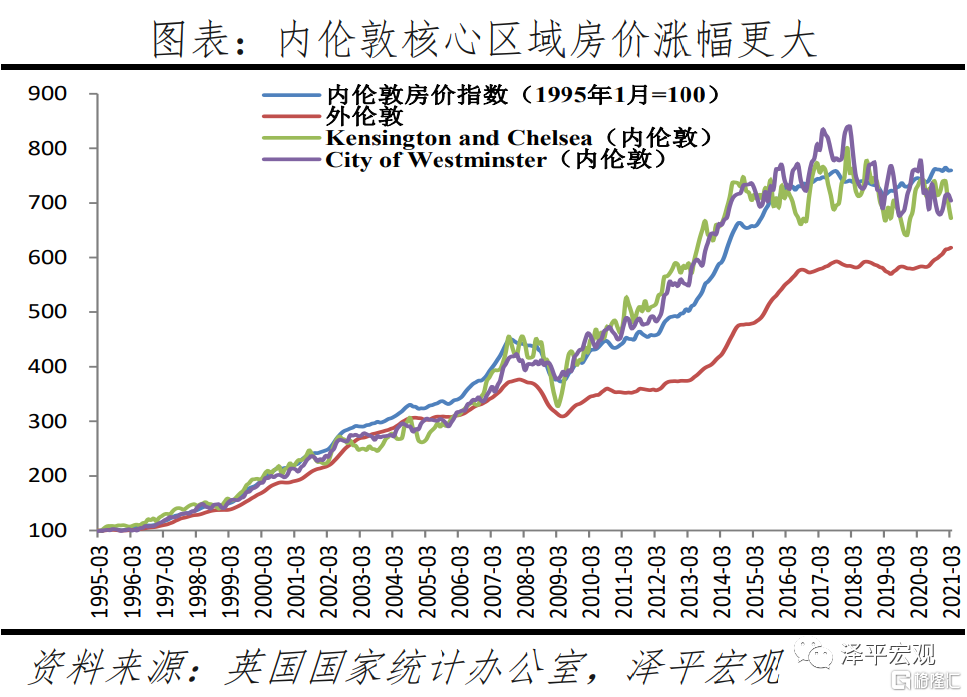 从大伦敦内部看,近26年内伦敦核心区域房价涨幅超7倍,外伦敦房价涨幅低于6.5倍。1995年1月至2021年3月,内伦敦房价从7.83万英镑/套涨至59.45万英镑/套,上涨7.6倍;外伦敦房价从7.30万英镑/套涨至45.10万英镑/套,上涨6.2倍。当前伦敦房价最贵是Kensington and Chelsea(122.72万英镑/套),其次是City of Westminster(93.68万英镑/套),分别较1995年1月上涨6.7倍、7.0倍。