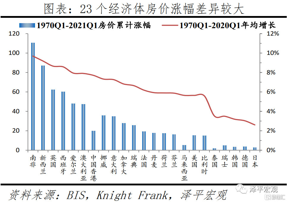 1970年Q1-2021年Q1,23个经济体房价平均累计上涨29.6倍、年均增长超6%。依据房价涨幅大小,可分为三类: