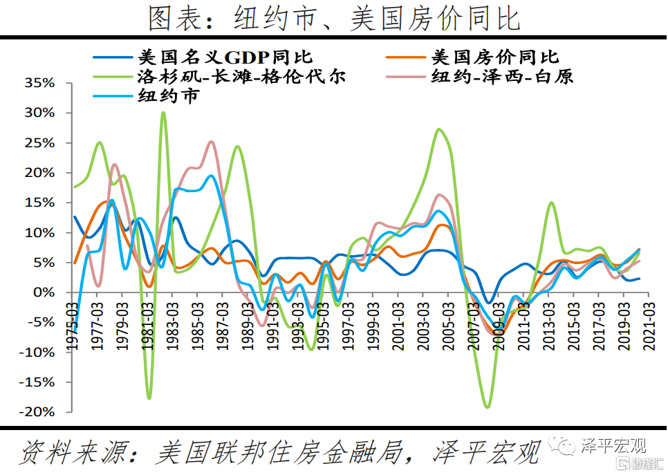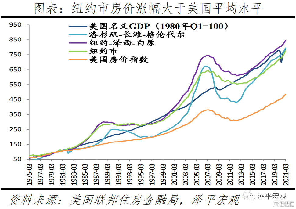近46年纽约市房价上涨超9倍,高于美国平均水平,但低于纽约市周边及洛杉矶地区房价涨幅。根据美国联邦住房金融局(FHFA)统计,1975-2021年Q1,美国、纽约市、纽约-泽西-白原分区(纽约都会区分区之一)(1976-2021年Q1)、洛杉矶-长滩-格伦代尔分区(洛杉矶都会区分区之一)房价分别上涨8.1倍、9.9倍、12.9倍、19.7倍,年均增速分别为4.9%、5.3%、6.0%、6.8%。纽约-泽西-白原分区房价涨幅虽不及洛杉矶-长滩-格伦代尔分区,但仍显著高于美国平均水平。此外,该时期美国名义GDP上涨13.7倍、年均增长6.0%,M2增长20.5倍、年均增长6.9%。这意味着,纽约市房价跑输同时期美国名义GDP和M2,而洛杉矶-长滩-格伦代尔分区跑赢美国名义GDP,接近M2。