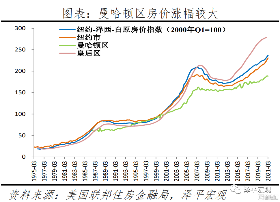在纽约市内部,曼哈顿区近30年房价上涨近2倍,高于纽约市水平。1991-2021年Q1,纽约市曼哈顿区房价上涨1.9倍、年均上涨3.7%,皇后区(1991-2020年)房价上涨2.8倍、年均上涨4.7%,而该时期纽约市和纽约分区房价分别上涨1.8倍、2.0倍,年均增速分别为3.5%、3.8%。