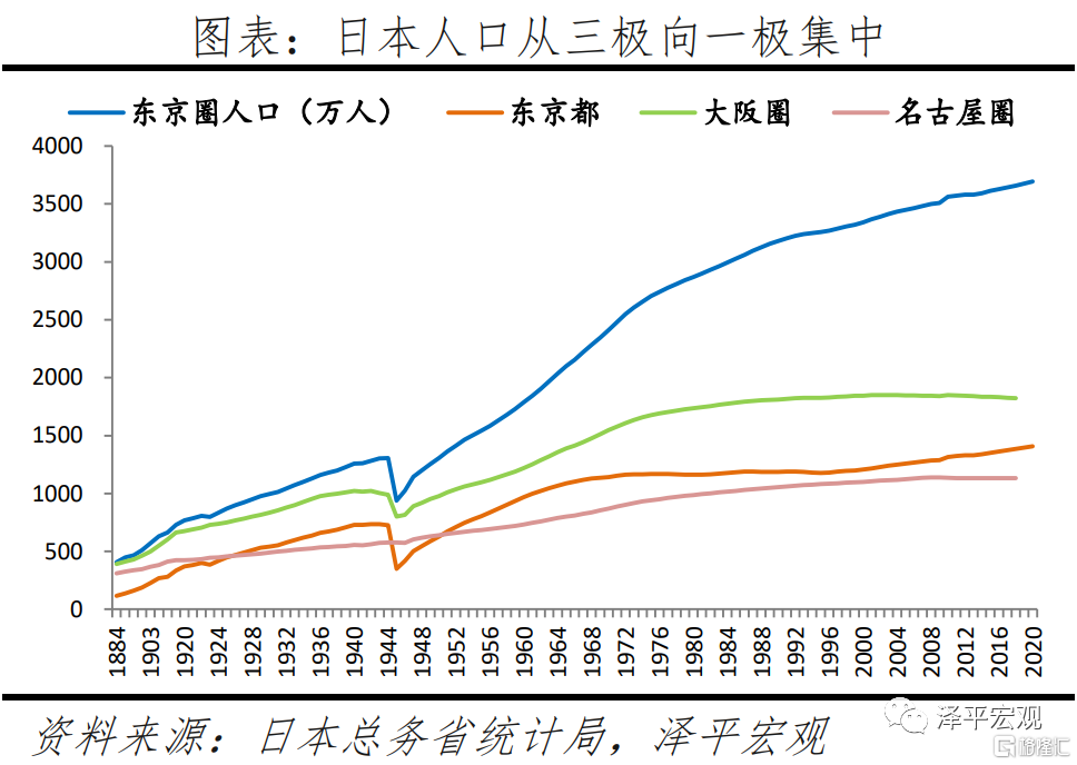 日本人口流动分为两个阶段:在1974年前,全国人口基本持续向东京圈、大阪圈、名古屋圈三极集聚。1884-1973年,除战争影响外,东京圈人口406万人增至2607万人,占比从10.8%增至23.9%;大阪圈人口从392万人增至1636万人,占比从10.5%增至15.0%;名古屋圈人口从311万人增至918万人,占比从8.3%增至8.4%。之后则转为向东京圈一极集中,而名古屋圈人口流入流出基本平衡、大阪圈长期净流出;到2016年,东京圈、大阪圈、名古屋圈人口分别为3629、1831、1134万,占比分别为28.6%、14.4%、8.9%,该时期大阪圈和名古屋圈人口增长主要源于自然增长。东京都人口在1970-1997年人口增长停滞,主要在于东京都区产业转移、人口外迁,但东京都非都区、东京圈三县人口显著增长。