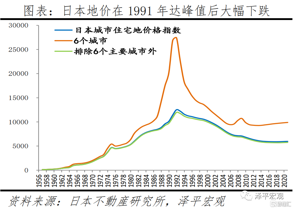 1975年日本房价调整后还能继续上涨,主要在于经济增长和主力购房人群支撑,但因后期上涨过快、出生人口大幅下滑、1990年代主力置业人群见顶以及日本政府错误应对等,导致1990年代初房地产泡沫破灭。之后日本地价持续调整至2005年,2017年日本地价仅是峰值的47.1%。六个核心城市地价从1992年一直下跌到2005年,在经历了2006-2008年的短期上涨之后,因全球金融危机于2009-2012年再次下跌,2013年开始回升至今,2017年地价仅相当于1991年峰值的35.3%;因人口流出,日本非核心城市地价从1992年一直下跌,2017年地价相当于1991年峰值的47.5%。