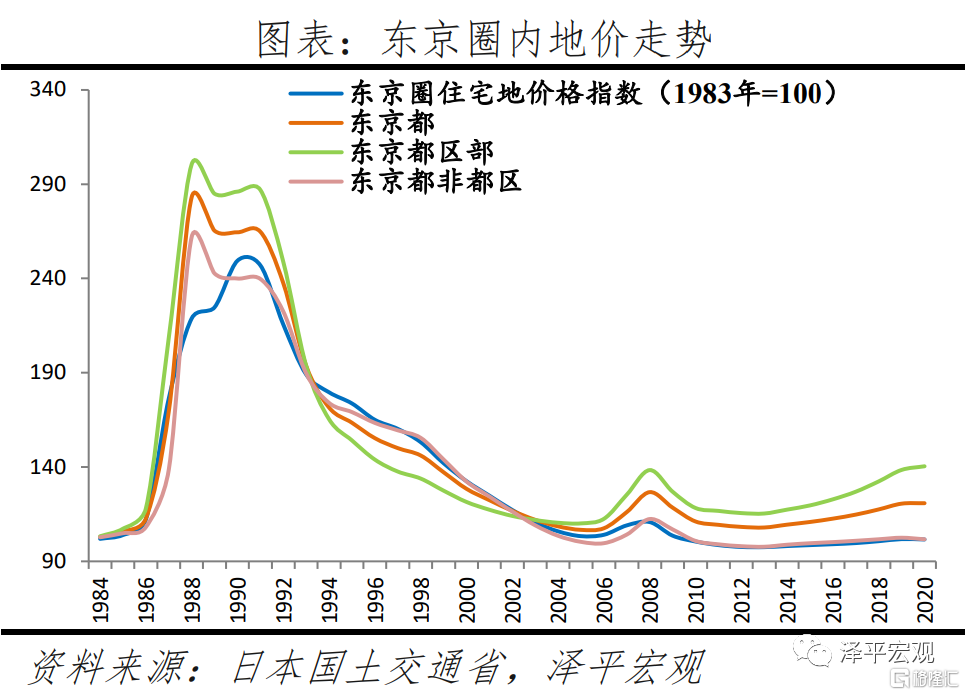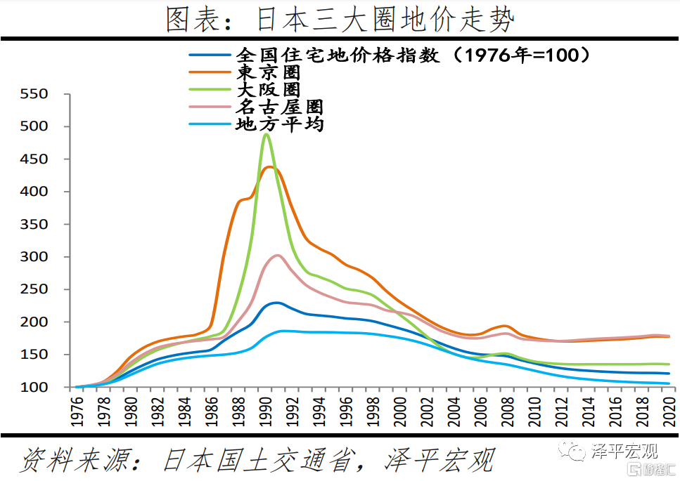 1990年代初房地产泡沫破灭后,东京圈地价大幅下跌至2005年,2006-2008年开始回升,但受全球金融危机影响于2009年开始再次调整,2014年开始再次回升。至2020年,东京圈、大阪圈、名古屋圈、地方地价仅分别是峰值的40.7%、27.8%、59.0%、56.7%。大阪圈地价之所以调整幅度最为惨烈,是因为其在泡沫破灭前上涨幅度最大、又缺乏人口支撑。