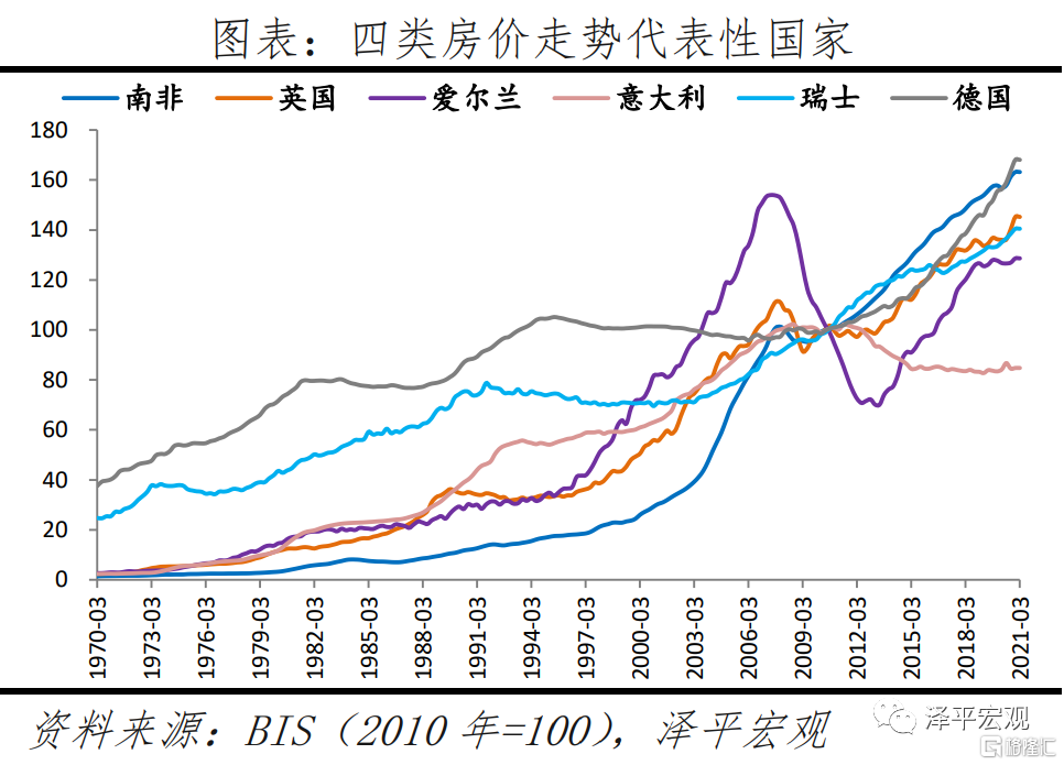 三是房价累计涨幅在5倍以内和年均增长低于4%的以内的,有泰国、瑞士、韩国、德国、日本5个经济体。其中泰国1991Q1-2021Q1年上涨1.8倍,年均增长3.5%;韩国1975年Q1-2021年Q1房价累计上涨3.2倍、年均增长3.2%;1970年Q1-2021年Q1,瑞士、德国、日本房价累计上涨4.8倍、3.6倍、2.7倍,年均增长3.5%、3.0%、2.6%。