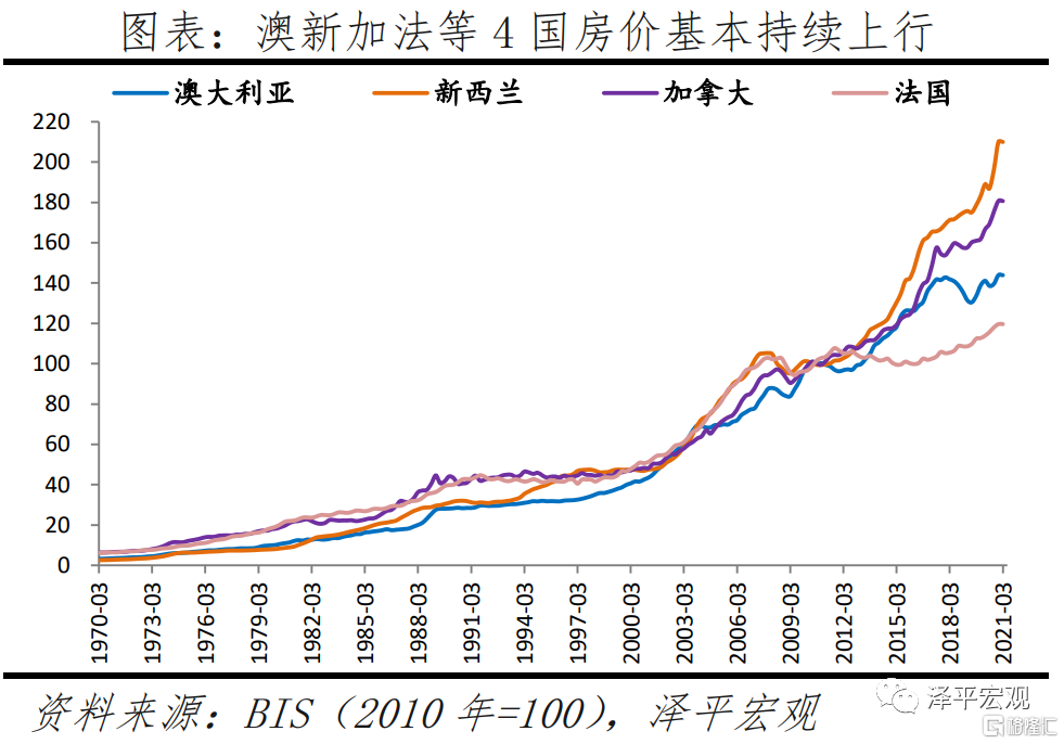 一是房价基本持续上行、期间调整幅度小的经济体,有澳大利亚、新西兰、加拿大、法国等4个。1970年以来上述4国任何一次下行周期中累计下跌幅度均未超过9%。其中,澳大利亚、新西兰、加拿大等3国未曾出现连续两年下跌的情况;法国在1992-1995年、2008-2009年、2011-2015年三次明显调整,但三次累计跌幅均未曾超过7%。