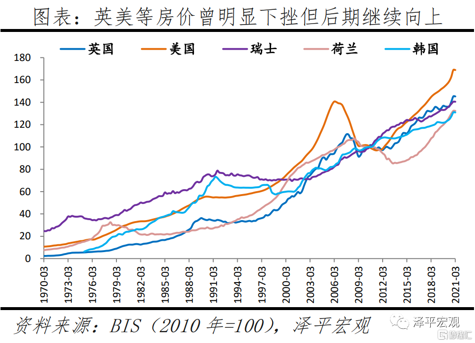 二是房价曾大幅下挫但后期上行超过之前高点的经济体,有英国、美国、瑞士、荷兰、南非、挪威、中国香港、马来西亚、泰国等14个。比如,荷兰房价在1979-1982年暴跌近30%、2008-2013年大跌超19%,南非房价在1984-1986年下跌11%,芬兰房价在1990-1992年暴跌37%,瑞士房价在1990-1998大跌22%,马来西亚、泰国分别在1997-1998、1998-1999年累计下跌均超过11%,中国香港在1998-2003年累计暴跌超60%,美国房价在2007-2011年大跌超30%,英国房价在1990-1992年下跌近11%、2008-2009年下跌超13%。上述经济体房价在大幅下跌后继续向上,现均已超过之前高点。