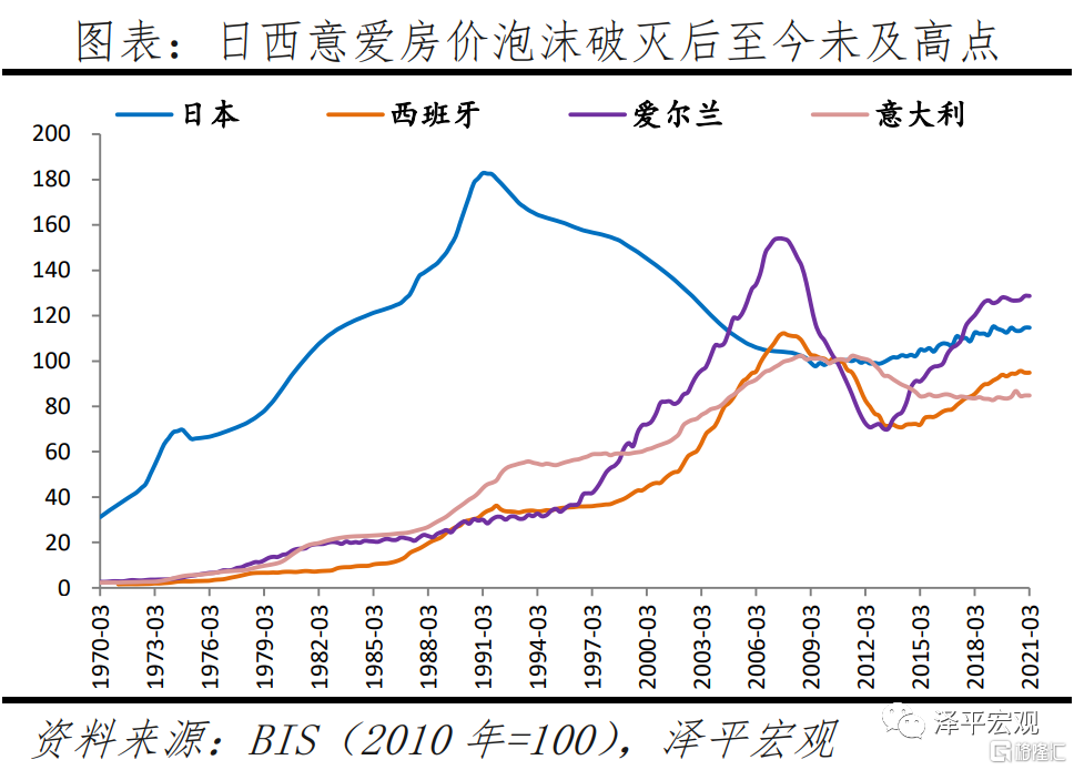 三是前期房价泡沫破灭、至今仍不及高点的经济体,有日本、西班牙、爱尔兰、意大利等4个。虽然时代和国别不同,但历次房地产泡沫堆积无一例外受到流动性过剩和低利率的刺激,而历次房地产泡沫崩溃则都跟货币收紧和加息有关。日本、西班牙、爱尔兰、意大利房价分别在1990、2007、2007、2008年见顶,其中前三个国家房价近几年稍有反弹,2020年上述四国房价仅分别相当于峰值的63.4%、84.7%、84.8%、83.2%。