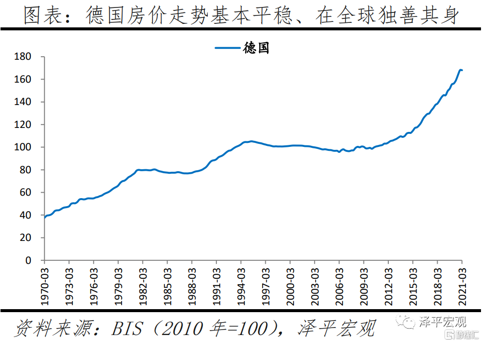 四是房价走势基本平稳、涨幅总体较小的经济体,只有德国1个。1970年以来德国房价有三次比较大的上涨周期:1971-1981年累计上涨近1.8倍,1987-1994年累计上涨35.1%,2009-2021年Q1累计上涨67.6%;而在任何一个下行周期中累计下跌未曾超过10%。