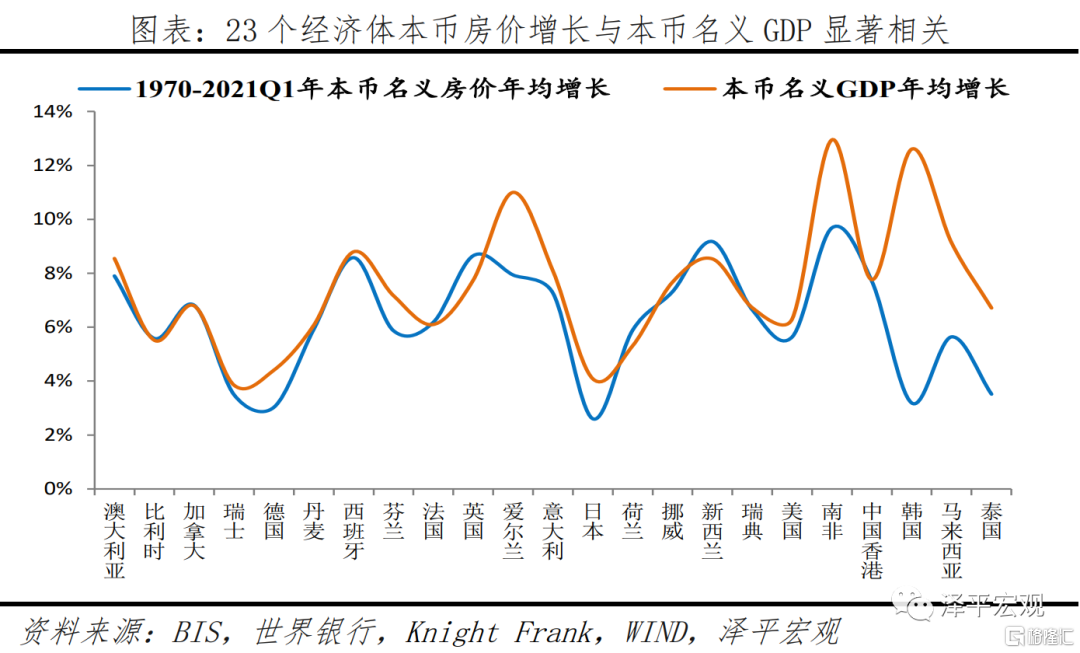 3)货币供应带来的货币幻觉。从国际经验看,在经济发展过程中,绝大部分国家均存在不同程度的货币超发,从而引起资产价格变化。一般而言,广义货币供应增速高则通胀高。1970-2021Q1年,23个经济体年均GDP平减指数平均数为4.3%、中位数为4.0%,不仅在绝对水平上与23个经济体房价年均增长的平均数6.3%较为接近,而且波动较为一致。比如,1970-2021年Q1,南非广义货币增长532.5倍,在货币大幅超发下南非名义GDP增长390.2倍,实际GDP仅增长1.9倍,GDP平减指数增长130.2倍,房价上涨101.6倍;美国广义货币增长33.2倍,名义GDP增长19.0倍,实际GDP上涨2.8倍,GDP平减指数增长5.2倍,房价上涨13倍。但是,货币超发易滋生房地产等资产价格泡沫,极端情况下甚至可能引发经济危机,比如1990年代日本房地产泡沫和2007年美国次贷危机。