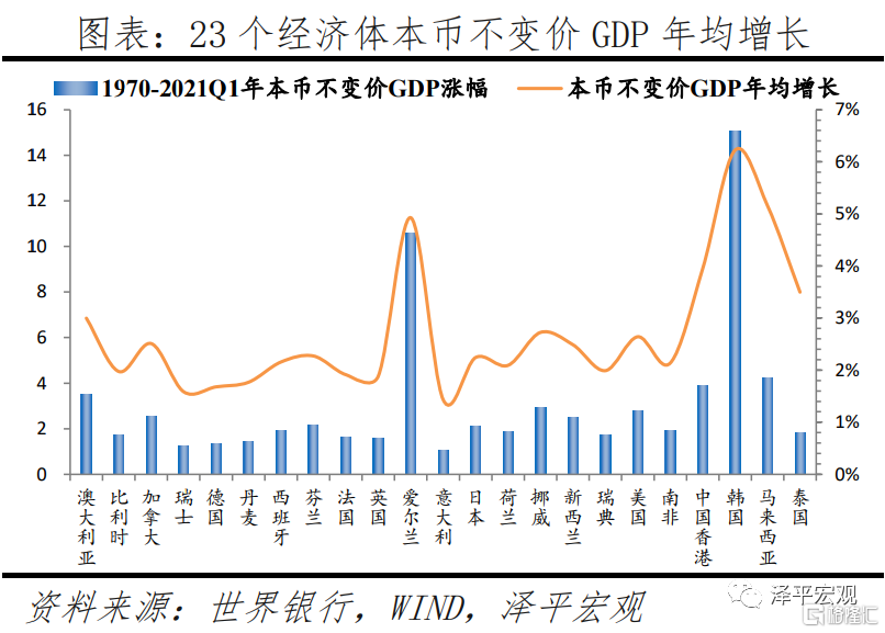 1)经济增长带来的收入效应。不变价GDP增长反映剔除价格后的真实经济增长,人均本币不变价GDP增长意味着居民实际购买力提高、增加房产需求。1970-2021年Q1,23个经济体本币不变价年均增长的平均数为2.7%、中位数为2.2%,人均本币不变价年均增速的平均数为1.9%、中位数为1.6%(部分经济体数据计算从有房价数据时开始,西班牙、中国香港、韩国、马来西亚、泰国分别从1971、1979、1975、1988、1991年开始)。其中,韩国人均本币不变价GDP年均增长高达5.3%,爱尔兰、中国香港、马来西亚、泰国年均增长均在2.5%以上,其他经济体多在2%以下,南非仅有0.2%。