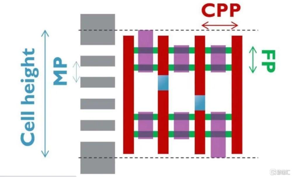 标准逻辑单元示意图(CPP=接触多晶间距,FP=鳍片间距,MP=金属间距;单元高度=每个单元的金属线数x金属间距)