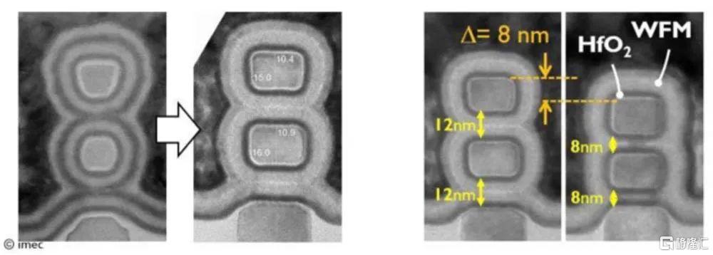 2018年,IMEC强调了引述可扩展工作功能今数的重要性,从而减少了纳米片堆叠所占的垂直空间。IMEC曾展示了将两个垂直纳米片之间的间隔物从13nm减少到7nm,并将芯片的AC性能提升了10%。