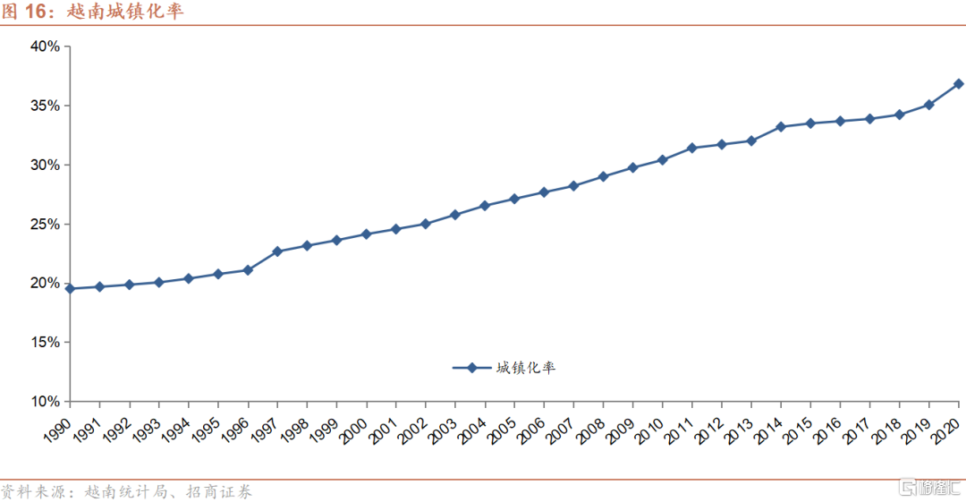 2020年,越南居住在城镇的人口占比为36.8%,较2010年提升6.4个百分点;与中国相比(2020年:63.9%)仍有较大的提升空间。