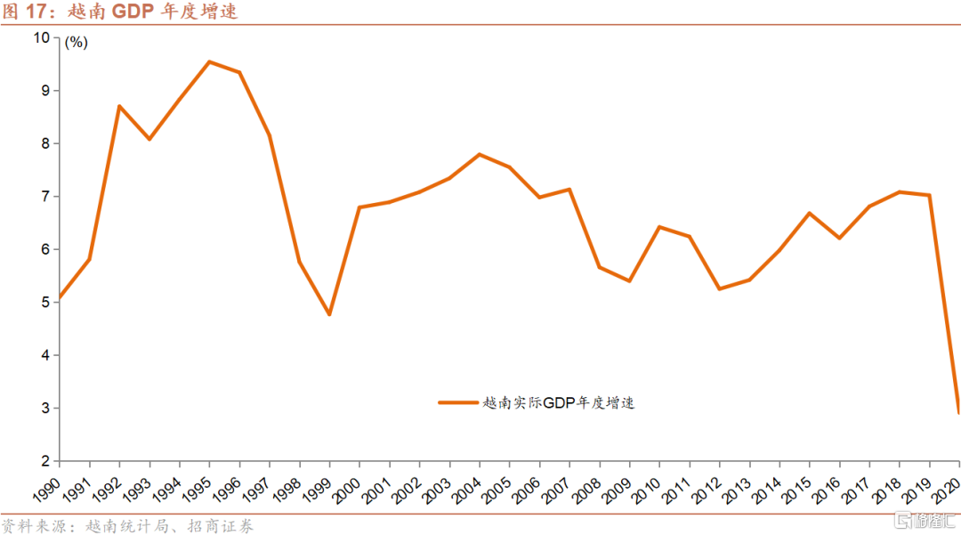 整体经济现况:在开启改革开放并进入经济全面发展的三十年间(1990-2020年),越南GDP保持在年均增速6.7%的水平。虽不及中国在改革开放初期三十年的增速高(1978-2008年均GDP增速:10.0%),但与其他东南亚经济体相比,其增速相对稳定且有较强的持续性,期间从未出现同比的负增长。越南在2020年的GDP总量为3,406亿美元,根据IMF口径,位列全球第40大经济体;人均GDP为3,497.5美元,大概相当于中国2008年的水平。根据2020年数据,越南三大产业中增加值中,第一产业占GDP比重为15%,第二产业占比为41%,第三产业为44%(中国2020年三产占比分别为:7.7%、37.8%、54.5%),服务业占比仍然相对偏低。越南有巨大的产业结构升级的空间。与此同时,中国则面临部分产业向外转移的趋势,这个节点为越南制造业提供了有利的外因。