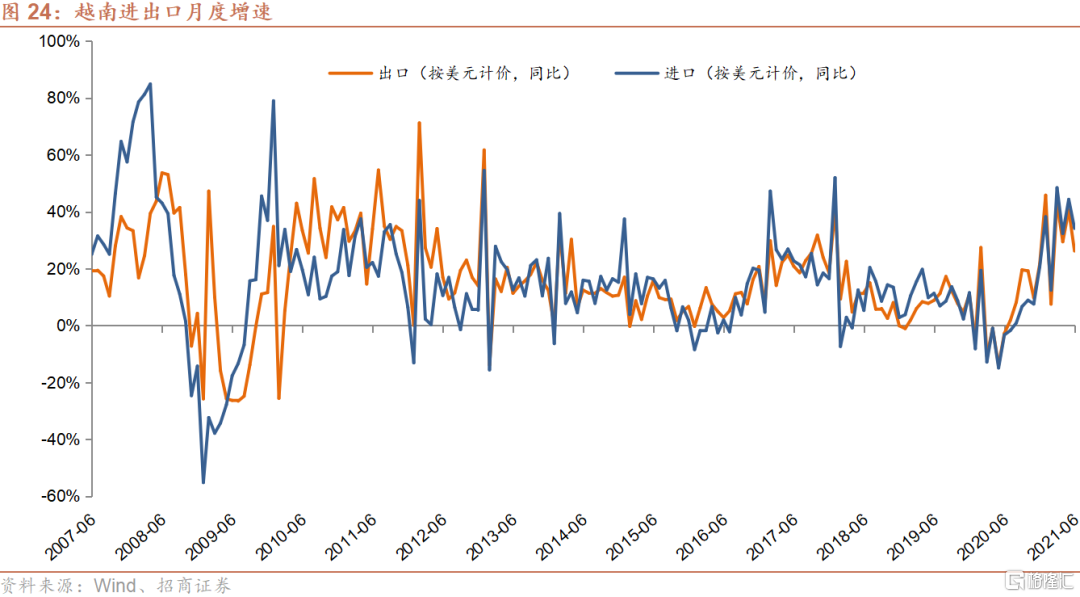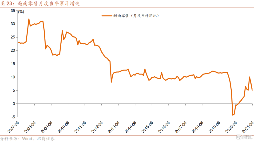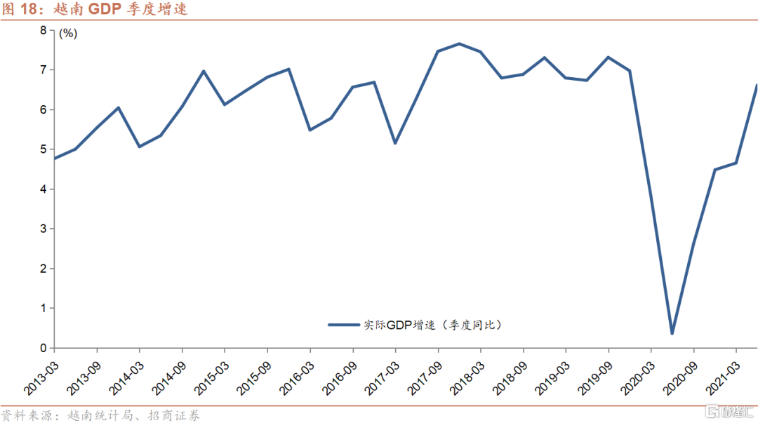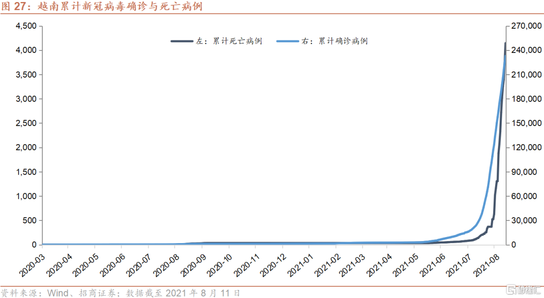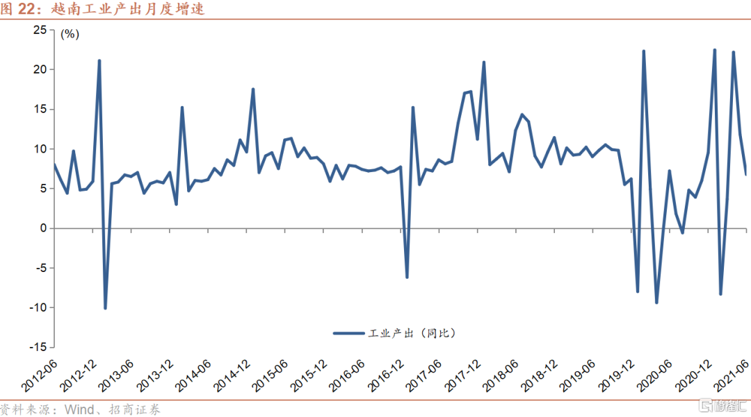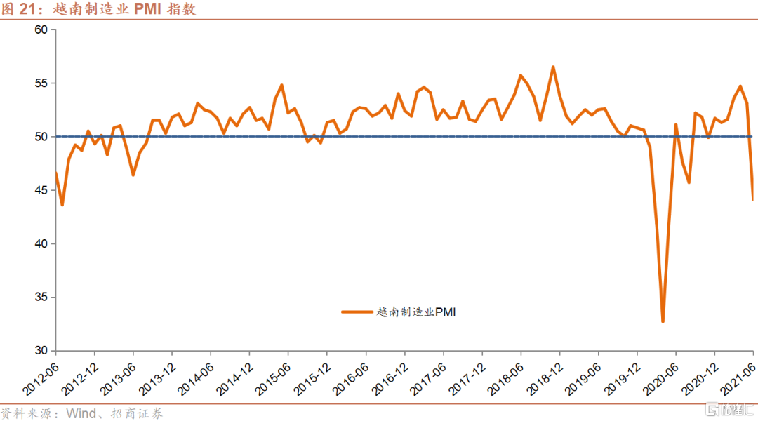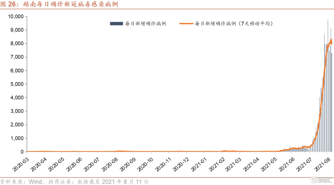 然而,随着印度于今年4月份开始的第二波疫情的蔓延,以及其境内演变出的Delta变异病毒株向印度周边的南亚以及东南亚国家扩散,越南自5月下旬开始每日确诊人数迅速攀升,由最初的几百人,在短短的几个星期内便上升至千人以上,并且在8月9日创下了目前为止单日确诊人数的纪录9,904例。世界衞生组织(WHO)也于6月4日证实,越南当局认为该国出现一种新的变异新冠病毒,结合了在印度和英国发现的两种现有变异病毒的特征。根据媒体的相关报道,越南数家大型制造业企业包括外资厂商已于近期停工,一些因为工厂内已爆发新冠疫情,其余则为防止疫情进入园区。预期这一波疫情以及相应的停工潮将对越南三季度的经济表现产生较为明显的负面影响。