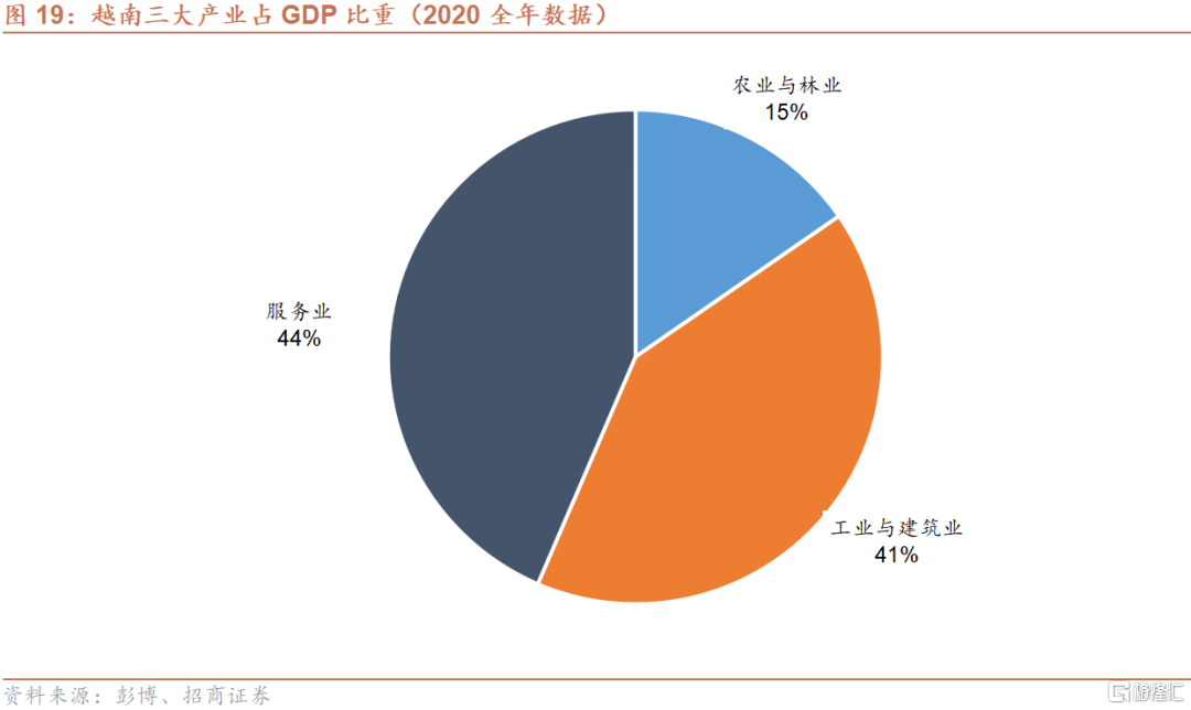 从产业结构来看,第一产业(农业与林业)占越南总GDP产出比重约为15%(2020全年数据,下同),依然处于相对高位。第二产业(工业与建筑业)占总GDP比重约为41%,其中工业(包括制造业、采矿业和公用事业)占整体第二产业产出的83%,建筑业占比为17%。服务业目前占GDP总产出44%的水平。