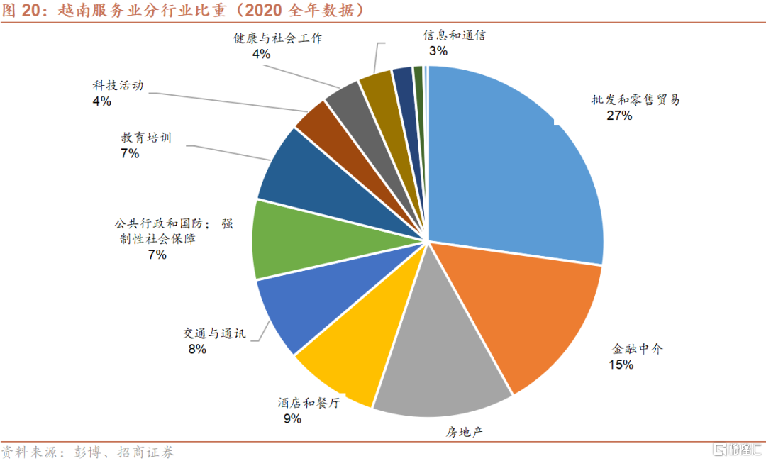 房地产市场与基建行业:潜力巨大但地缘政治风险仍是主要考量。越南目前城镇化率仅为36.8%,相当于中国2001年的水平,仍然有较大的上升空间。胡志明市与河内等核心城市在过去数年录得人口净流入,有望为房地产市场与基建投资需求提供长期有力支持。2015年越南政府放松了对外国人投资当地房地产的限制,极大的提振了房地产市场;但新冠疫情以来,外国人到访的显著减少导致高端住宅板块的投资活动受到显著的负面影响。