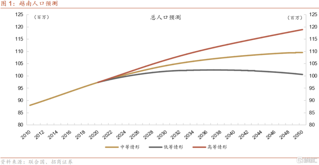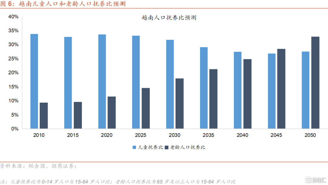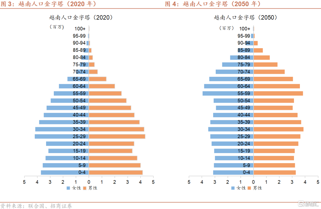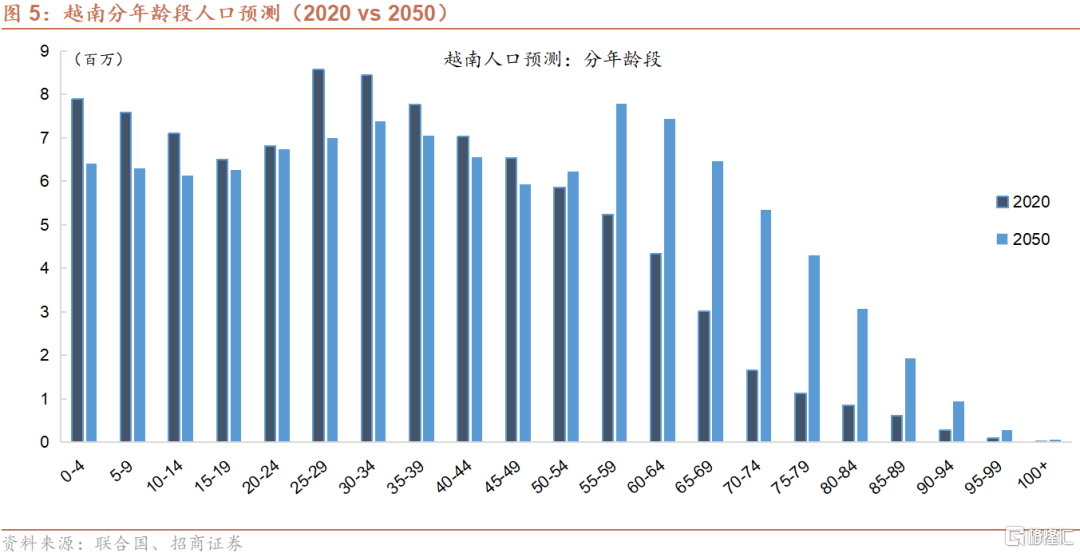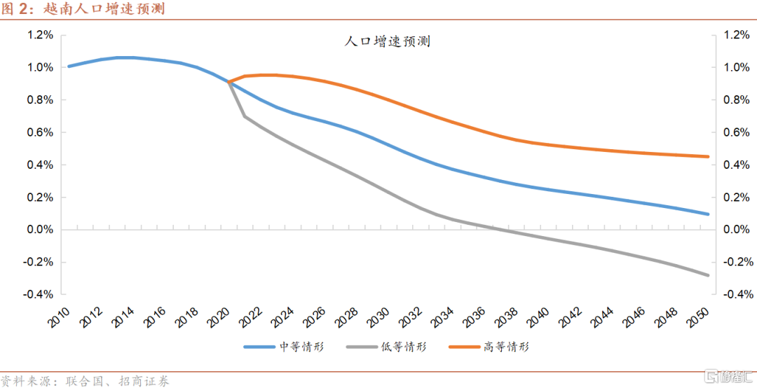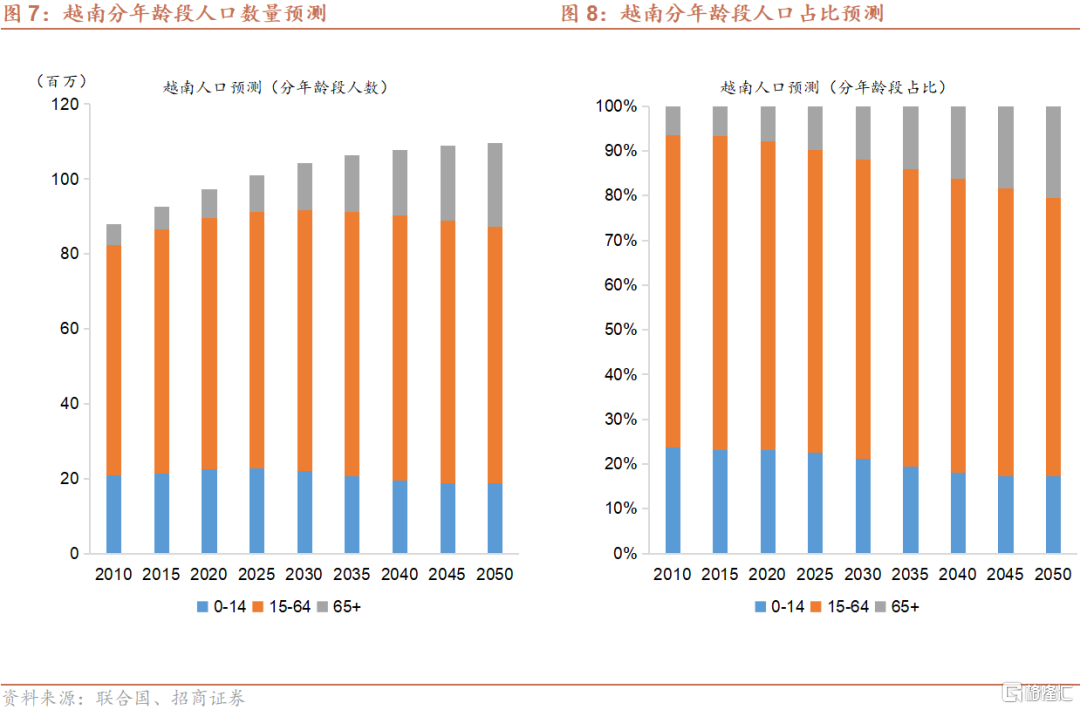 根据联合国的预测,越南总人口将在2030年达到1.011亿,较2020年增长7.0%,2020-2030年均复合增长率约为0.7%;到2050年达到1.096亿,较2020年增长12.6%,2020-2050年均复合增长率约为0.4%。到2050年,0-14岁、劳动年龄、65岁以上人口占比分别为17.2%、62.4%和20.4%;与2020年相比,0-14岁和劳动年龄人口占比分别下跌6.0和6.6个百分点,65岁以上人口占比则上升12.6个百分点。其中,劳动年龄人口将从2020年的6,710万上升至2040年的7,080万,此后逐步回落至2050年的6,840万。相比之下,根据联合国目前的预测(注:未反映近期全面三孩与配套政策的潜在影响),到2050年,中国0-14岁、劳动年龄、65岁以上人口占比分别为14.1%、59.8%和26.1%,反映与越南相比中国未来的少子化与老龄化程度更深。
